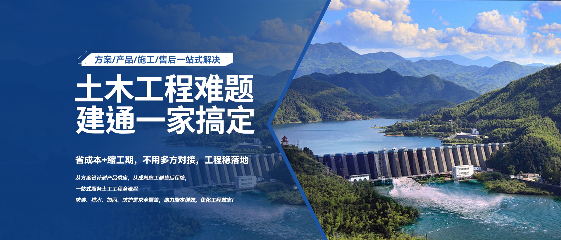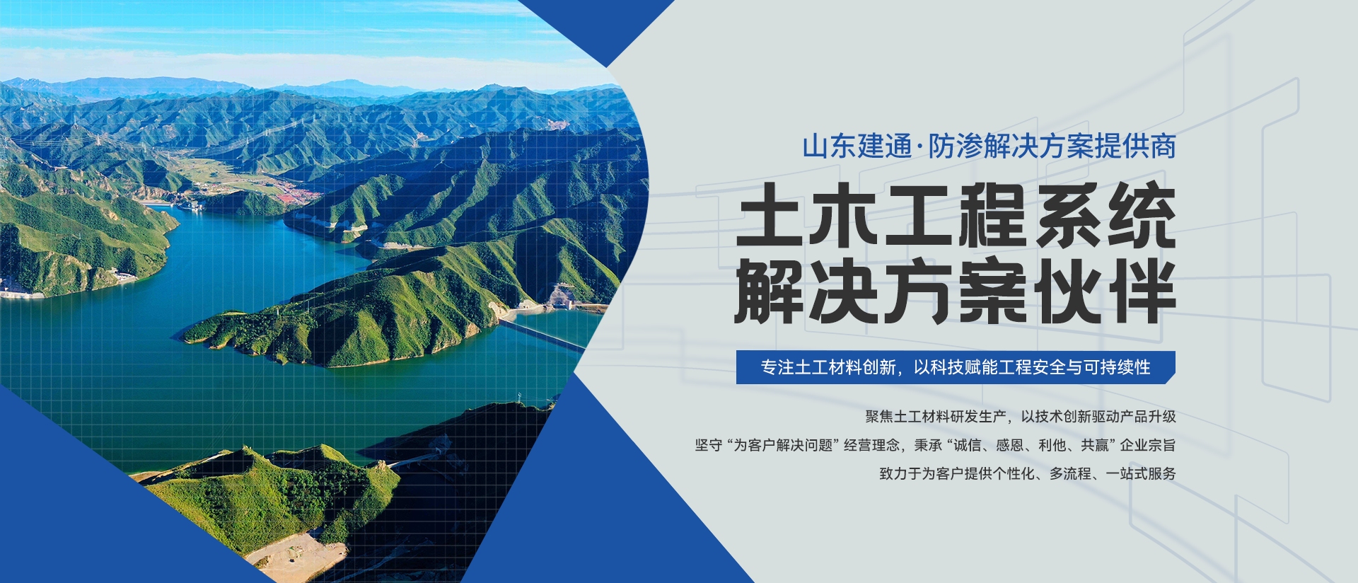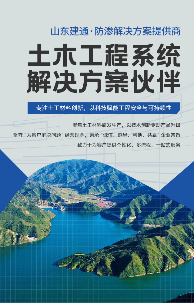 山东建通塑工科技有限公司深耕土工工程领域,是集研发、生产、施工、销售、服务于一体的一站式解决方案服务商,聚焦水力发电、电力建设、抽蓄工程、环保工程等核心场景。